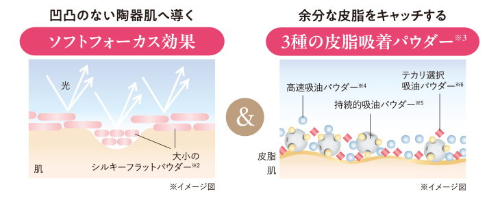 光を拡散し、シワや毛穴が目立ちにくいツルンとした肌を演出する「シルキーフラットパウダー※2」を配合。さらに、3種の皮脂吸着パウダー※3が、余分な皮脂を吸着し、つけたての美しさを長時間キープします。