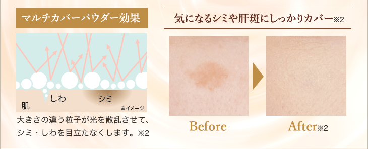 ・年齢肌のお悩みをカバーする大きさの異なるパウダーのことです。光を乱反射することで、ふんわりとした光で「シミ」や「シワ」を目立ちにくくするコンシーラー効果が期待できます。