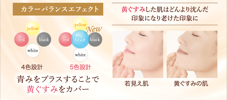 皮膚から青みが失われて起こる“老け見え=黄ぐすみ”に着目し、「青色」をプラスした新たなカラーコントロール機能を導入しました。気になる黄ぐすみをカバーし、健康的なお肌を演出します。