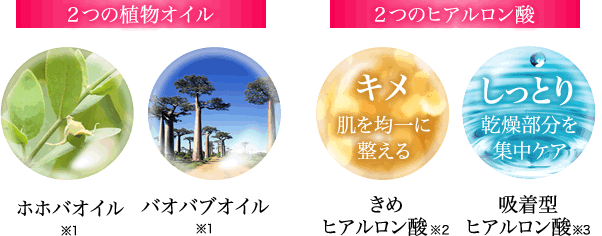 、アルガニアスピノサ核油、バオバブ種子油、ホホバ種子油、アセチルヒアルロン酸Na、ヒアルロン酸ヒドロキシプロピルトリモニウム、ボタンエキス、アカヤジオウ根エキス、イチョウ葉エキス、ラウリン酸ポリグリセリル-10